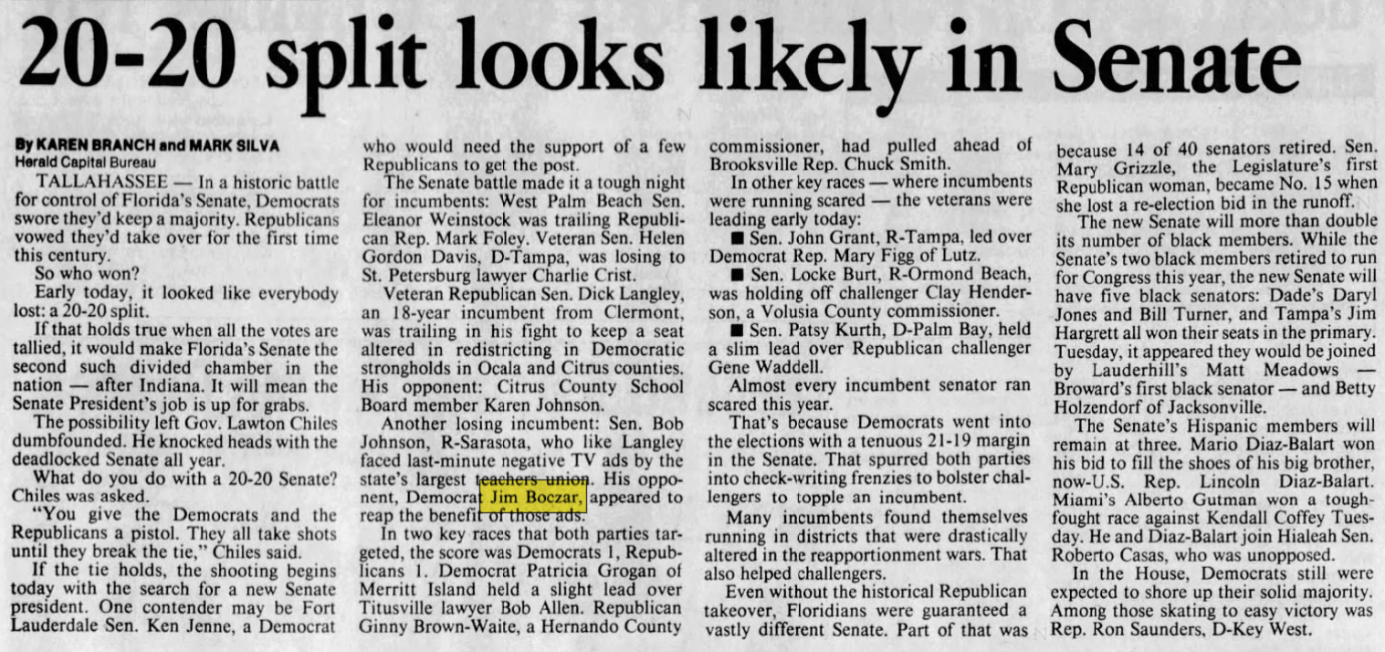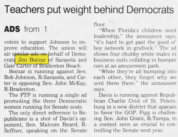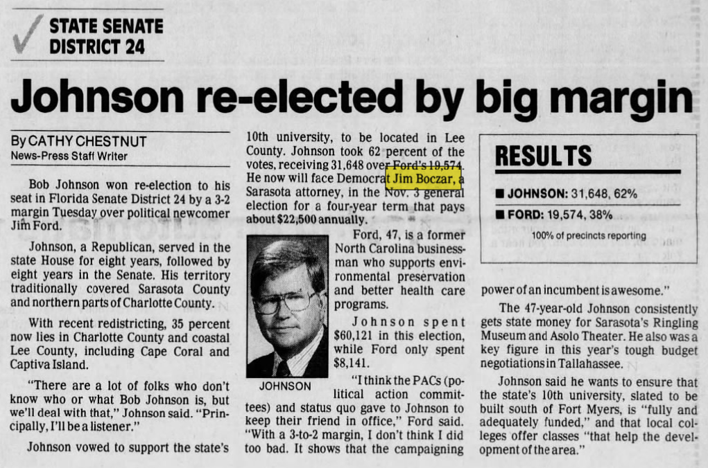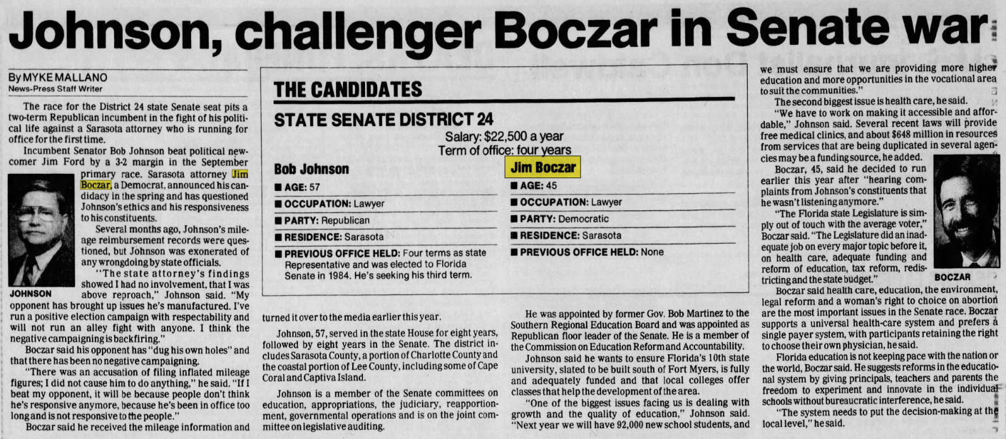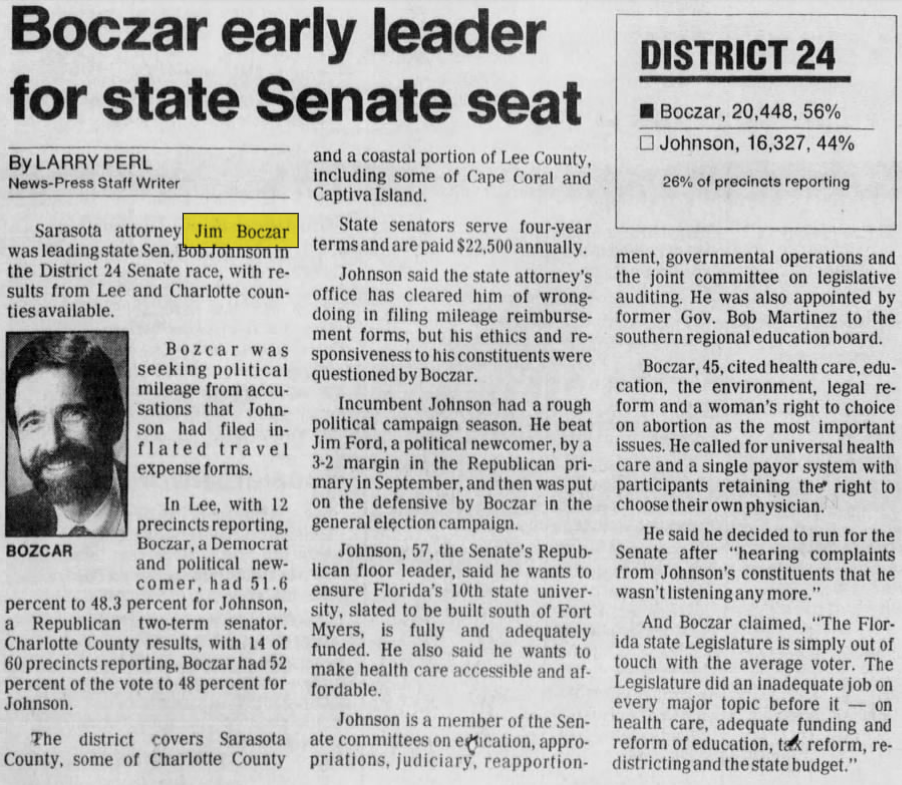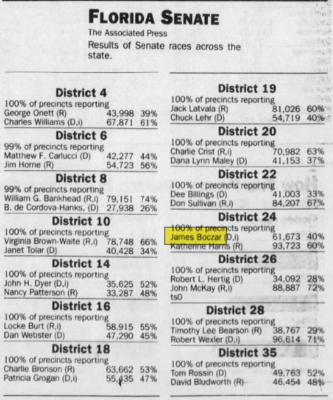 James Boczar (D) lost his reelection to Florida Senate race. Katherine Harris would go on to replace him.