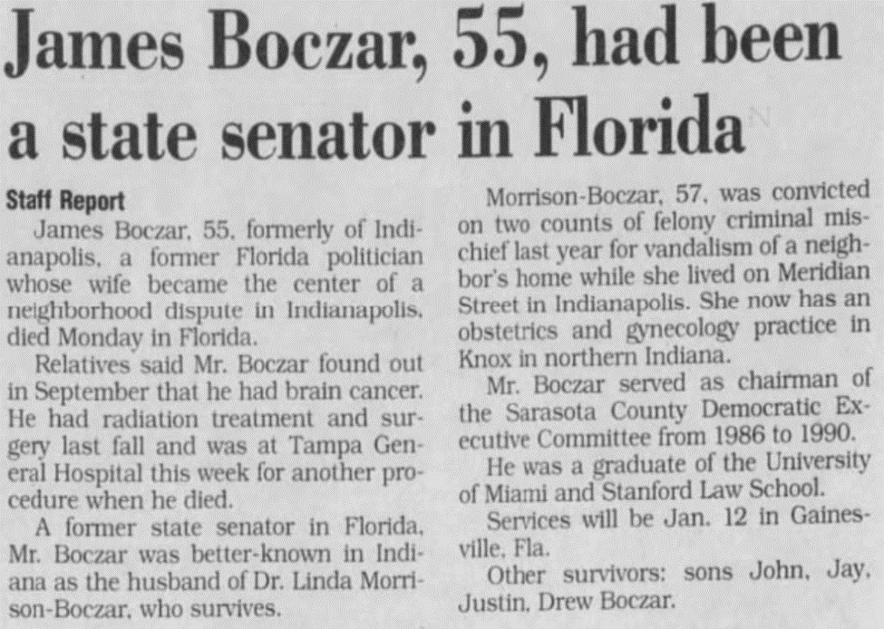 Jim Boczar death is in conflict. It was reported that he died of brain cancer at 55 on Jan 7, 2002; however, Linda’s statement on Morrison’s King County case (Sentencing Memorandum) would suggest it may have been suicide.
