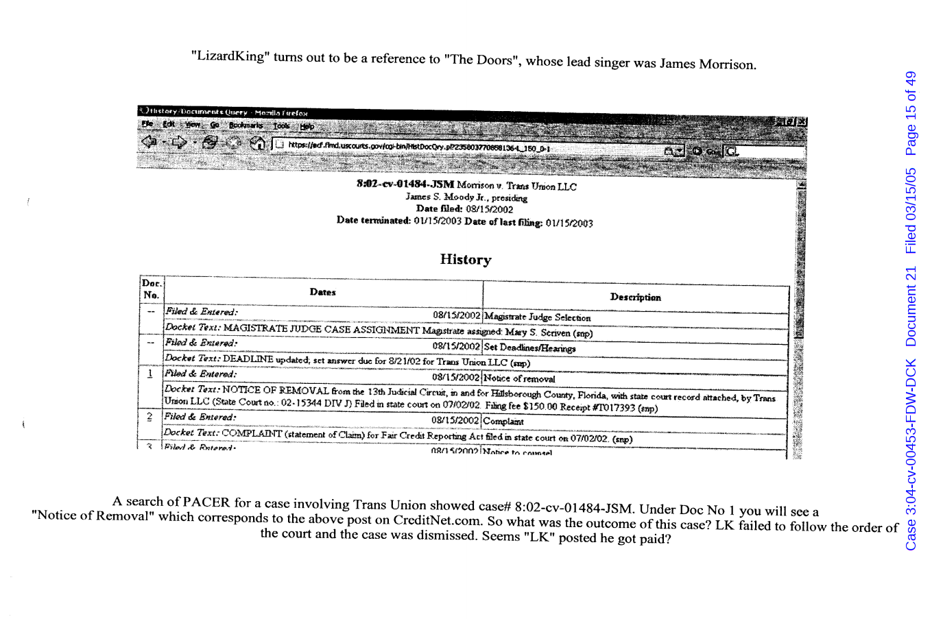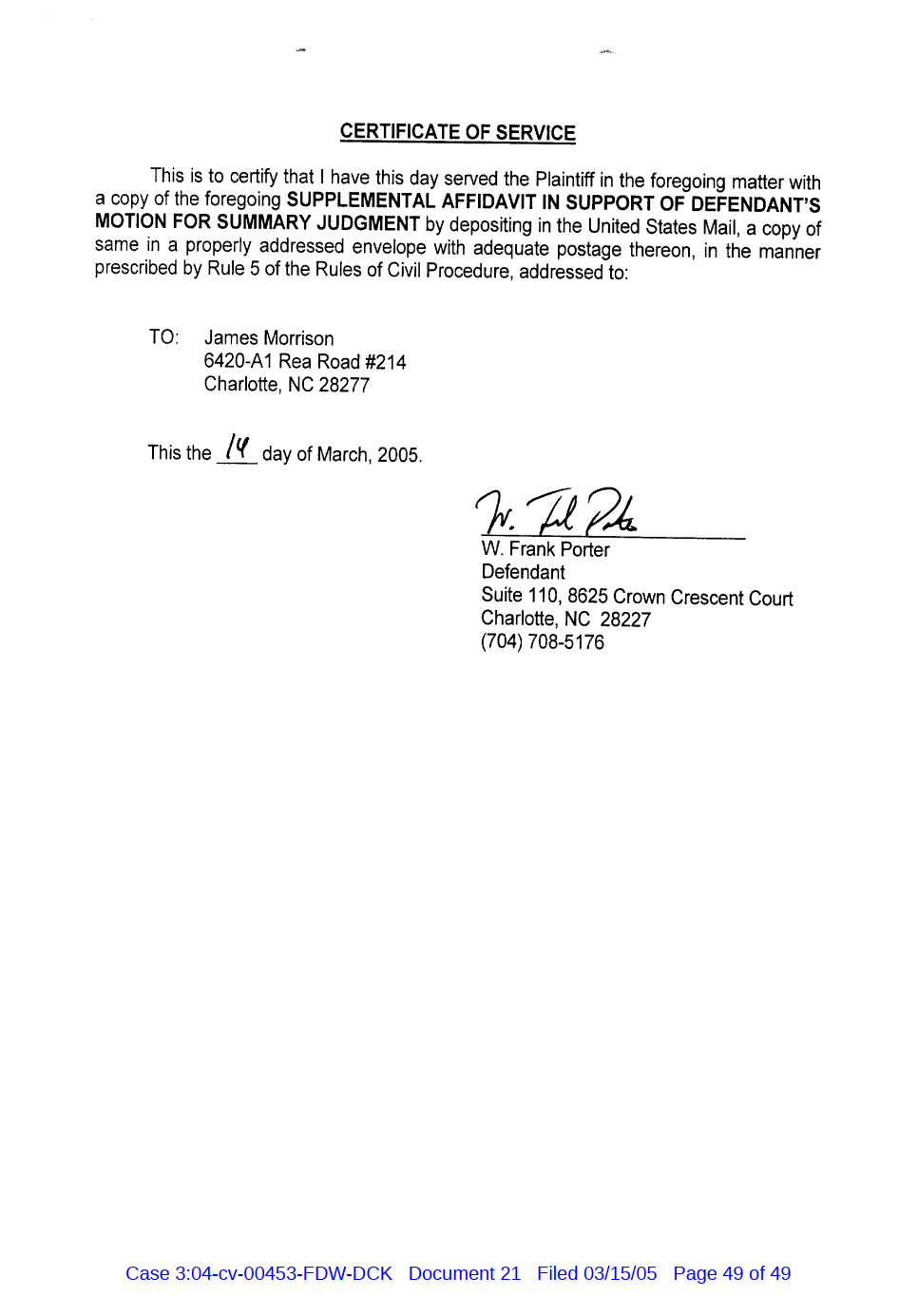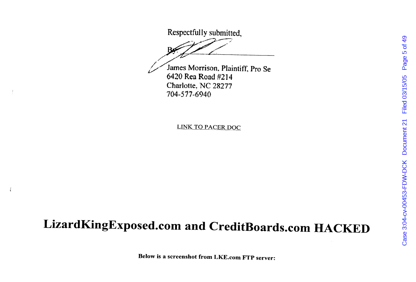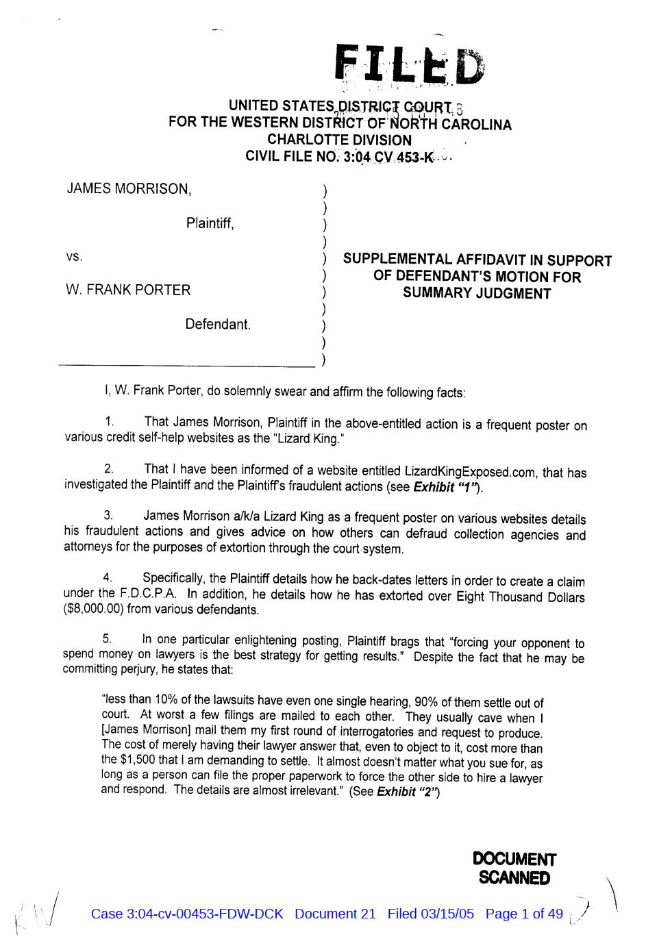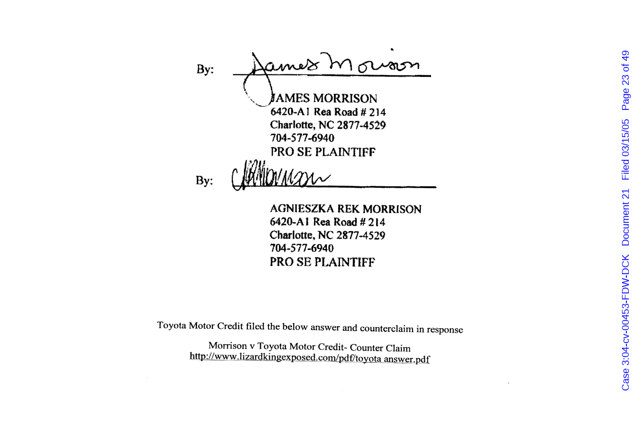 "Lizardking" Last updated on Sep 4, 2024 Public case filing was sourced from PACER from Western District Court of North Carolina. (2005) Morrison vs W. Frank Porter(Page 17 is blank) Previous Arrested for False Police Report Next Tesla Motor Club (2008-2013)