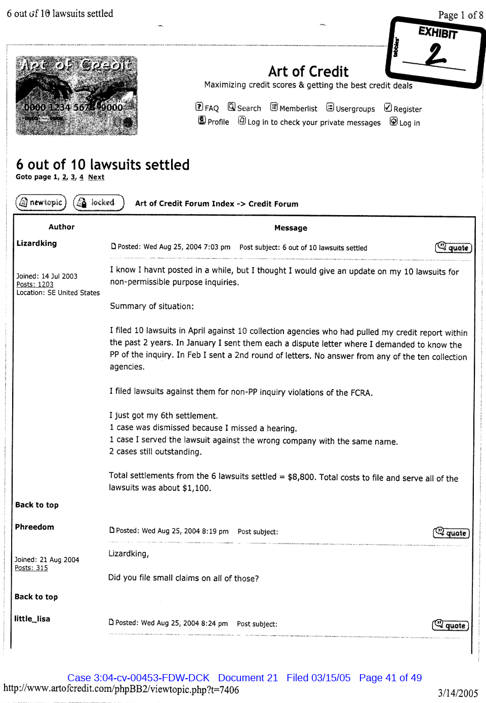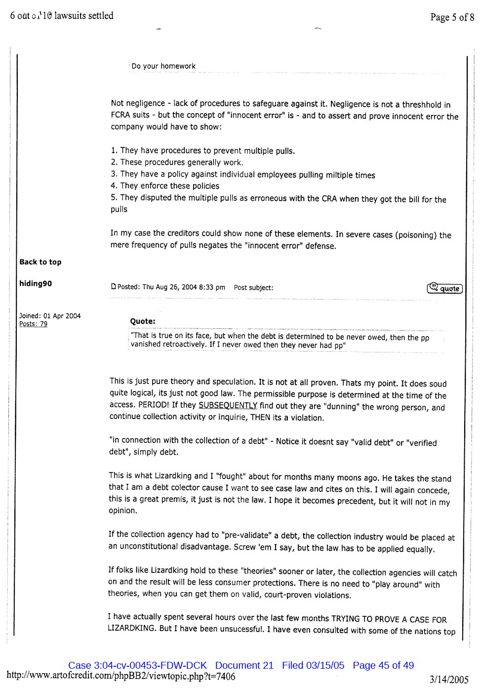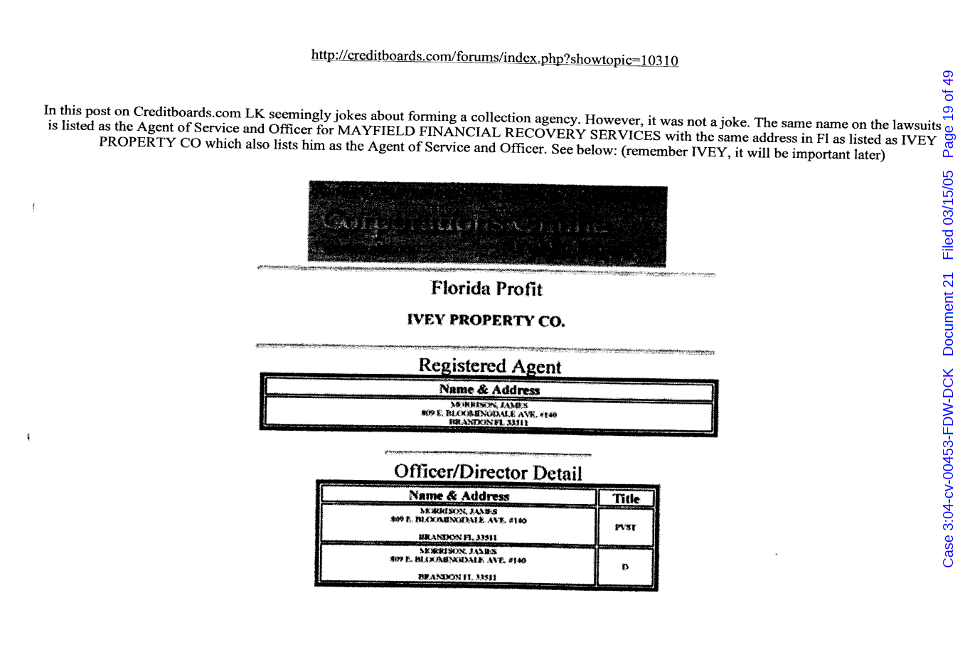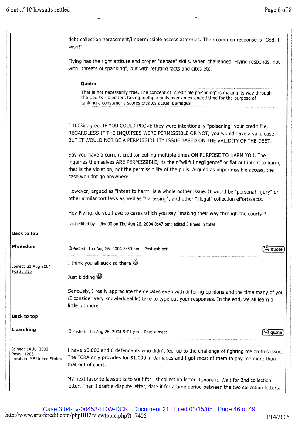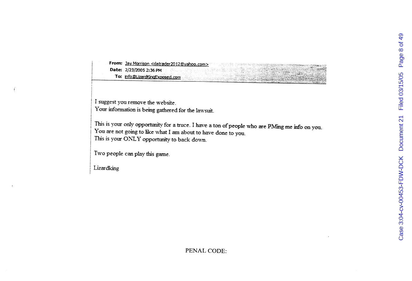 "Lizardking" Last updated on Sep 4, 2024 Public case filing was sourced from PACER from Western District Court of North Carolina. (2005) Morrison vs W. Frank Porter(Page 17 is blank) Previous Arrested for False Police Report Next Tesla Motor Club (2008-2013)