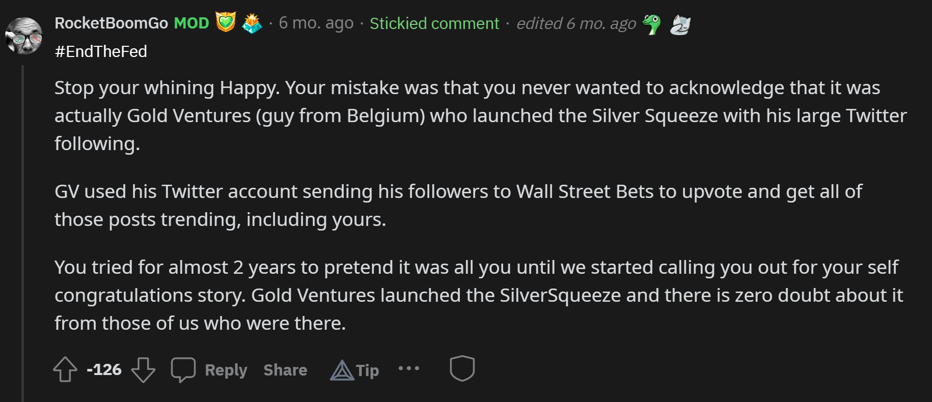 Morrison and others would get banned from Wall Street Bets because of growing community concerns that the #SilverSqueeze was a distraction away from their GME Squeeze. This led to Gold Ventures making an open public request for the founders of Wall Street Silver to contact him because he and Morrison wanted to be moderators of the community.