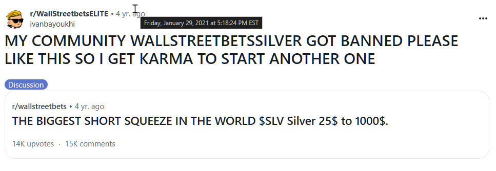 Later in the day, Ivan Bayoukhi announces on Reddit that his community "WallStreetBetsSilver" got banned by Reddit and needed help to build up karma on his new account to create a new community. This new community he created would become Wall Street Silver.