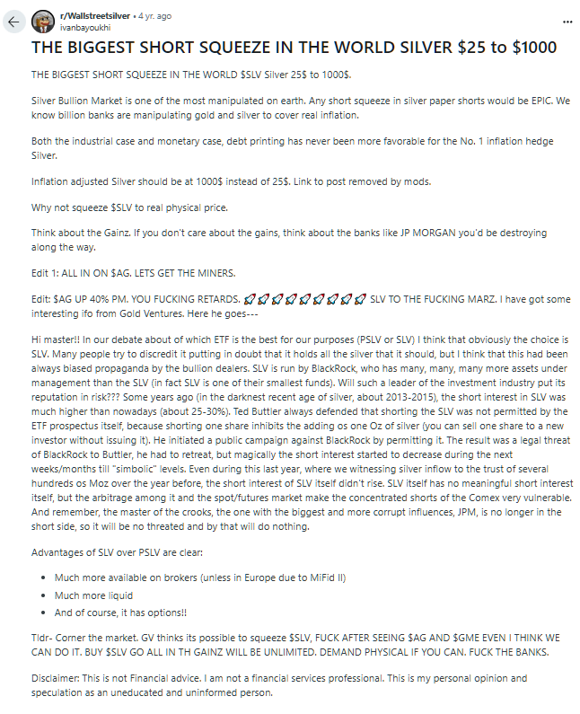 A random user named jjalaj30 posts on Wall Street Bets a post that would soon go viral. This user credits the idea to squeeze $SLV to GV or Gold Ventures.