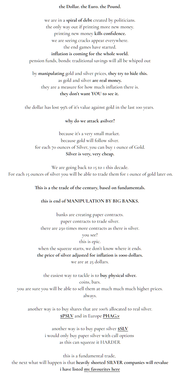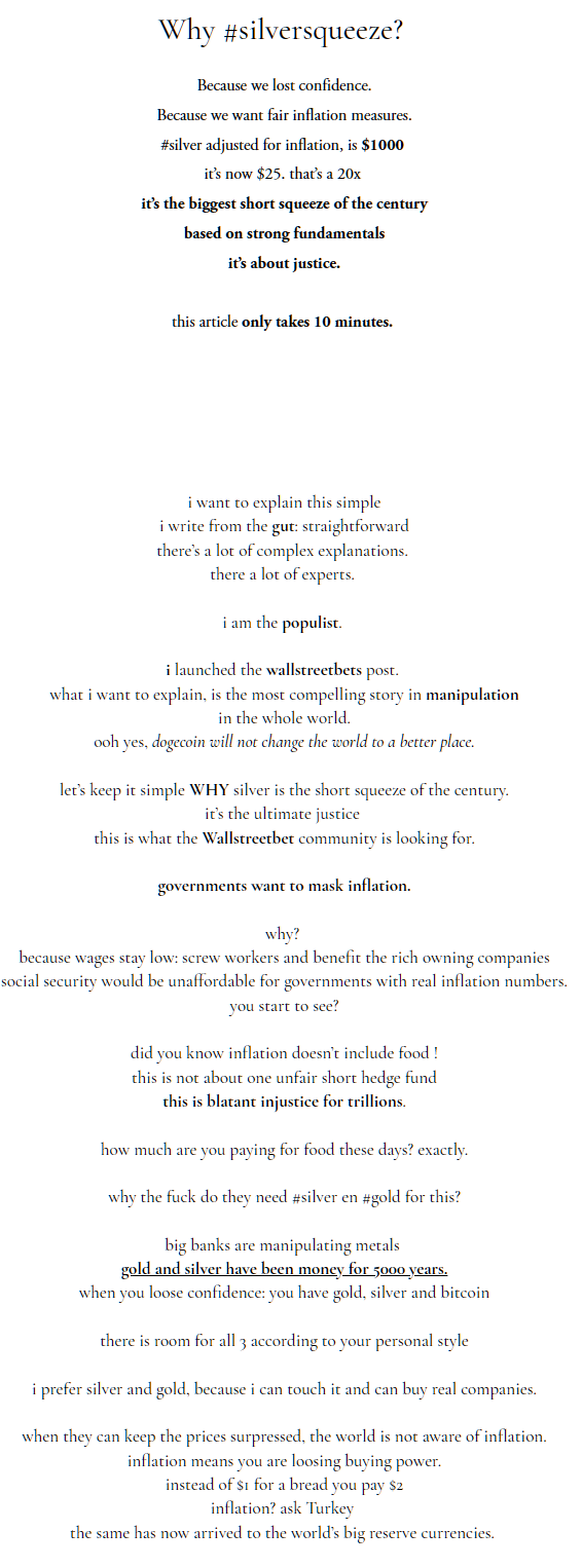 There are two #SilverSqueeze(s), one an organic movement that was formed to squeeze the physical silver market, and the other which was a scheme to take advantage of a small but growing silver enthusiasm within the Wall Street Bets community on Reddit by FinTwitt onlookers. Morrison's involvement in #SilverSqueeze is the latter.