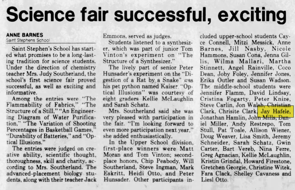 Jay attended Saint Stephen's Private School in Sarasota in 1984.The school hosted its first Science fair this same year. Jay participated, but did not win.